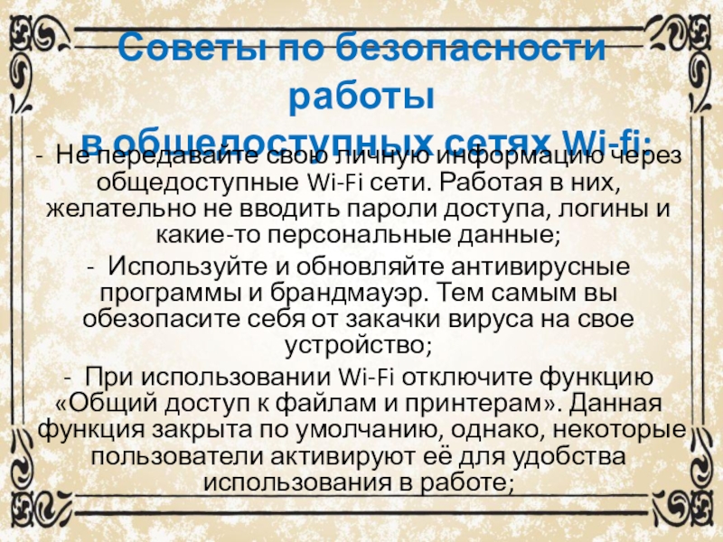 личную информацию через общедоступные Wi-Fi сети. Работая в них, желательно не вводить пароли доступа, логины и какие-то персональные данные;