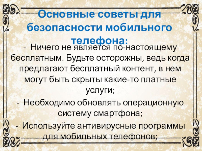 Слайд 22Основные советы для безопасности мобильного телефона: