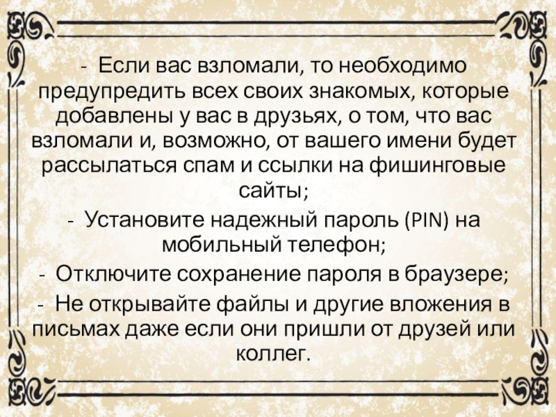 Слайд 26- Если вас взломали, то необходимо предупредить всех своих знакомых, которые