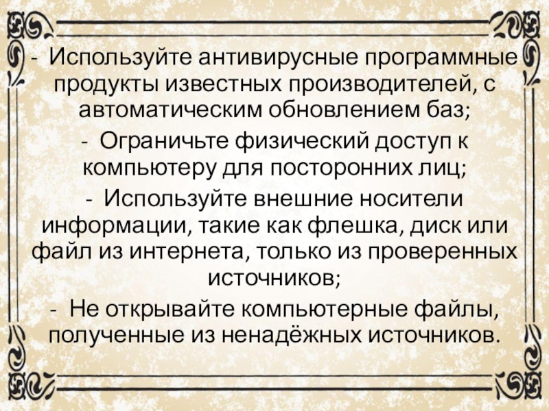 Слайд 6- Используйте антивирусные программные продукты известных производителей, с автоматическим обновлением баз;