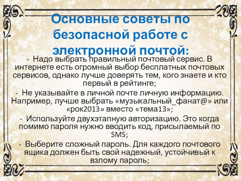 Слайд 17Основные советы по безопасной работе с электронной почтой: