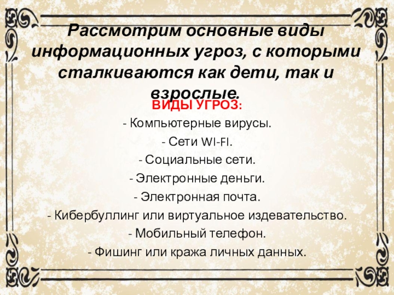 Слайд 3Рассмотрим основные виды информационных угроз, с которыми сталкиваются как дети, так
