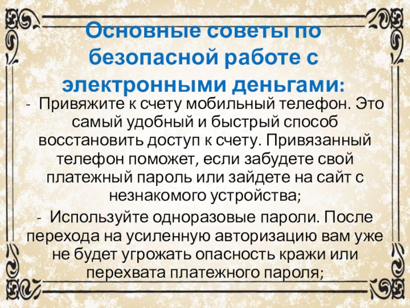 Слайд 14Основные советы по безопасной работе с электронными деньгами: