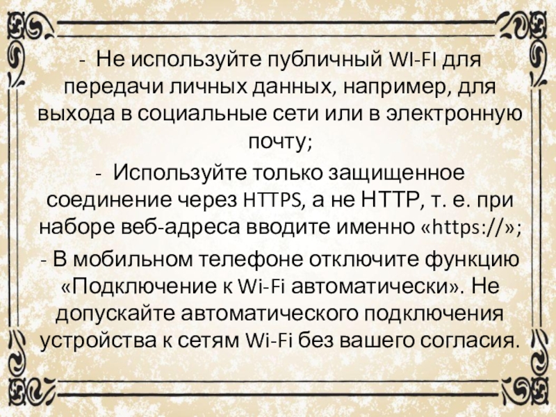 Слайд 9- Не используйте публичный WI-FI для передачи личных данных, например, для