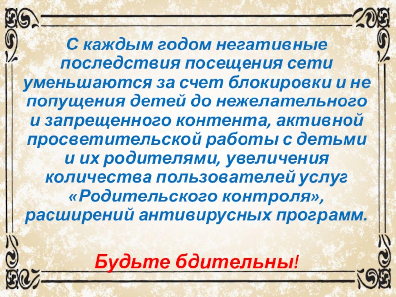 и не попущения детей до нежелательного и запрещенного контента, активной просветительской работы с детьми и их родителями, увеличения количества пользователей услуг «Родительского контроля», расширений антивирусных программ.