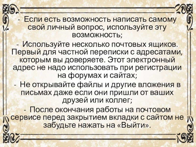 - Используйте несколько почтовых ящиков. Первый для частной переписки с адресатами, которым вы доверяете. Этот электронный адрес не надо использовать при регистрации на форумах и сайтах;
