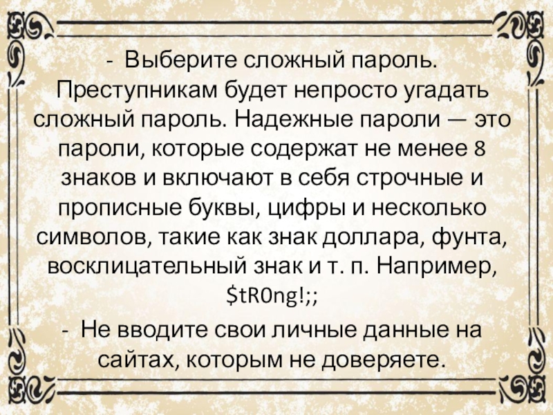 Слайд 15- Выберите сложный пароль. Преступникам будет непросто угадать сложный пароль. Надежные