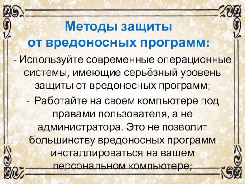 - Работайте на своем компьютере под правами пользователя, а не администратора. Это не позволит большинству вредоносных программ инсталлироваться на вашем персональном компьютере;