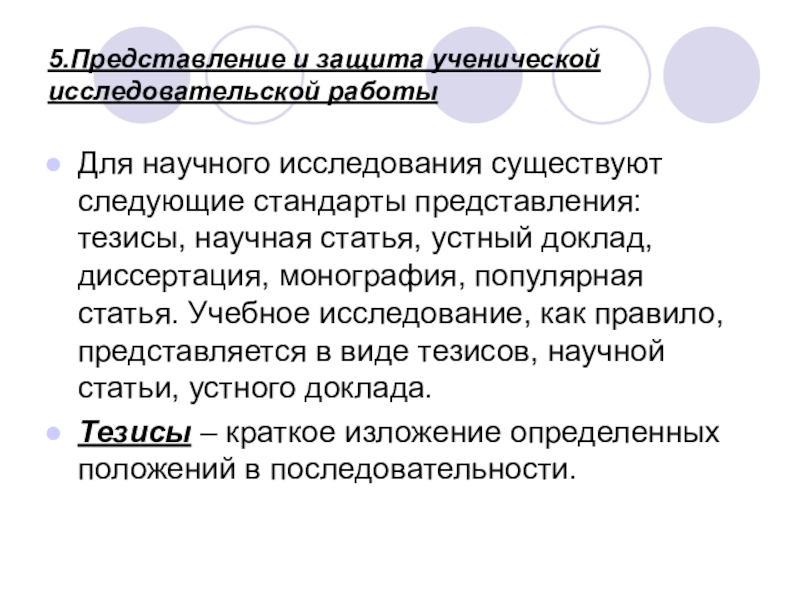 представления: тезисы, научная статья, устный доклад, диссертация, монография, популярная статья. Учебное исследование, как правило, представляется в виде тезисов, научной статьи, устного доклада.