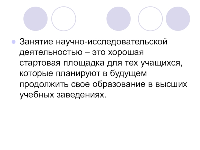 Слайд 29Занятие научно-исследовательской деятельностью – это хорошая стартовая площадка для тех учащихся,
