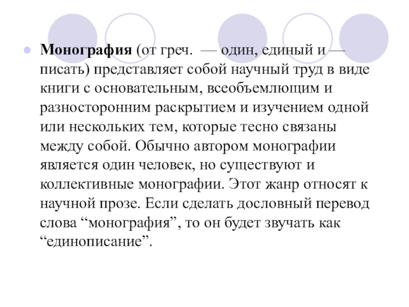 научный труд в виде книги с основательным, всеобъемлющим и разносторонним раскрытием и изучением одной или нескольких тем, которые тесно связаны между собой. Обычно автором монографии является один человек, но существуют и коллективные монографии. Этот жанр относят к научной прозе. Если сделать дословный перевод слова “монография”, то он будет звучать как “единописание”.