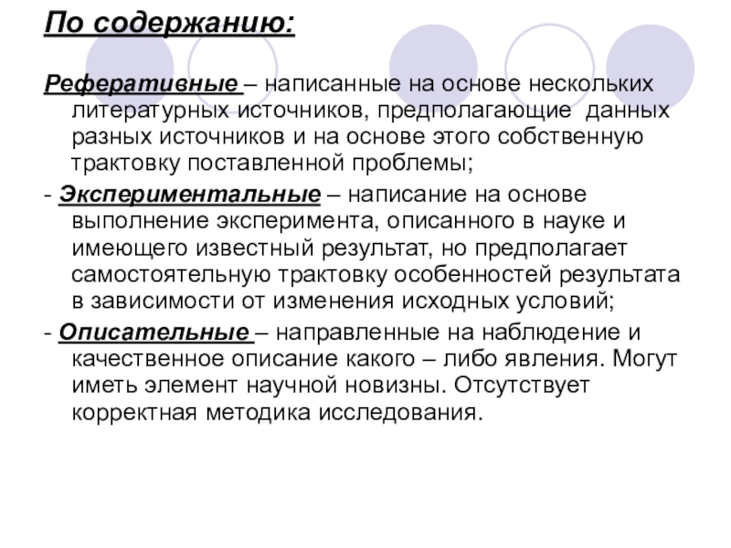 Реферативные – написанные на основе нескольких литературных источников, предполагающие данных