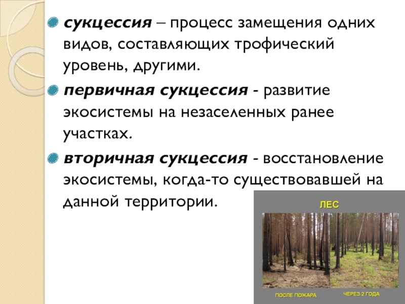 Слайд 8сукцессия – процесс замещения одних видов, составляющих трофический уровень, другими.