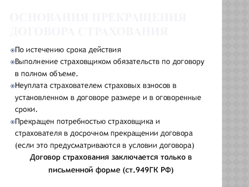 Основания прекращения договора страхования По истечению срока действияВыполнение страховщиком обязательств по договору в полном объеме.Неуплата страхователем страховых