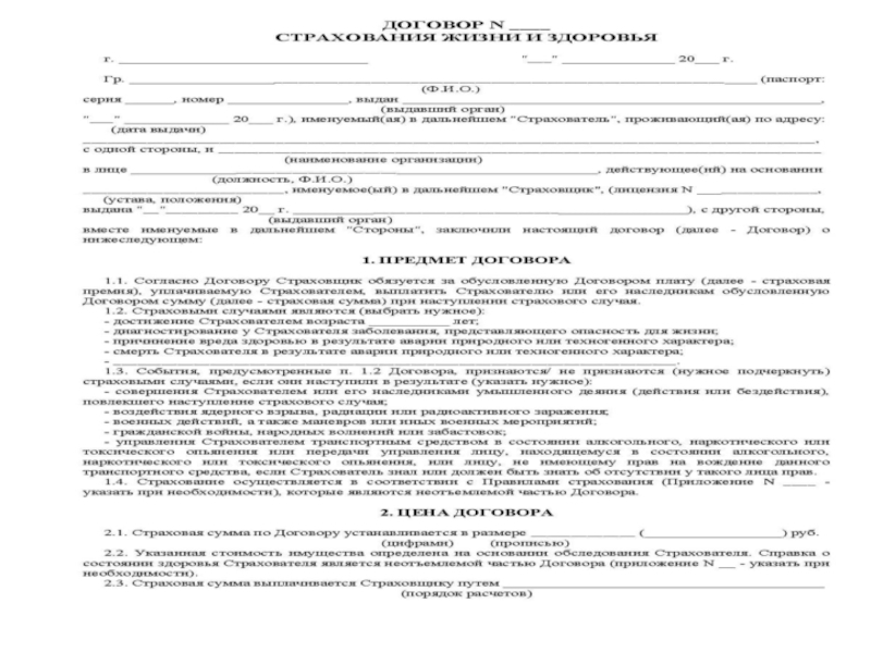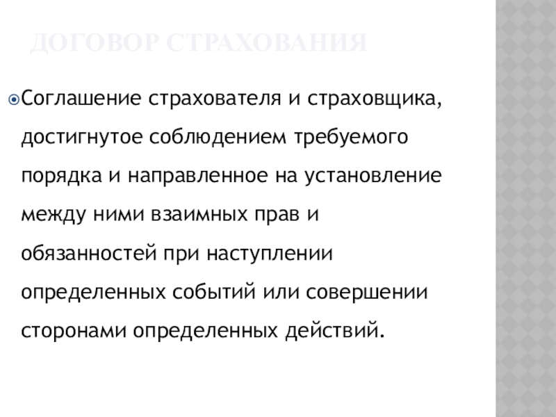 Договор страхования Соглашение страхователя и страховщика, достигнутое соблюдением требуемого порядка и направленное на установление между ними взаимных