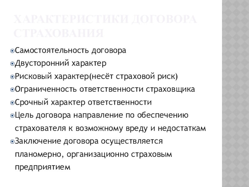 Характеристики договора страхования Самостоятельность договора Двусторонний характерРисковый характер(несёт страховой риск)Ограниченность ответственности страховщикаСрочный характер ответственностиЦель договора направление по