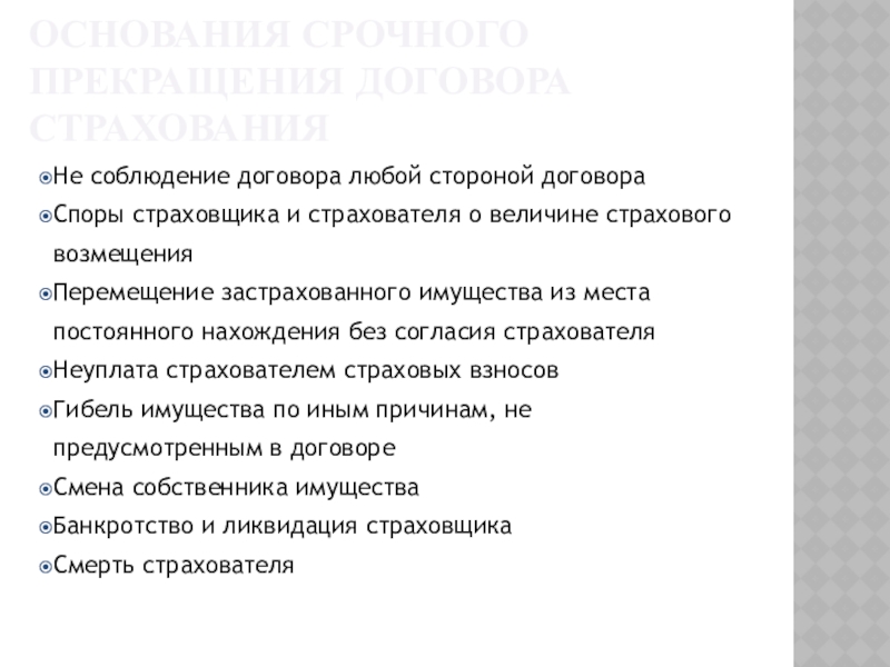 Основания срочного прекращения договора страхования Не соблюдение договора любой стороной договора Споры страховщика и страхователя о величине
