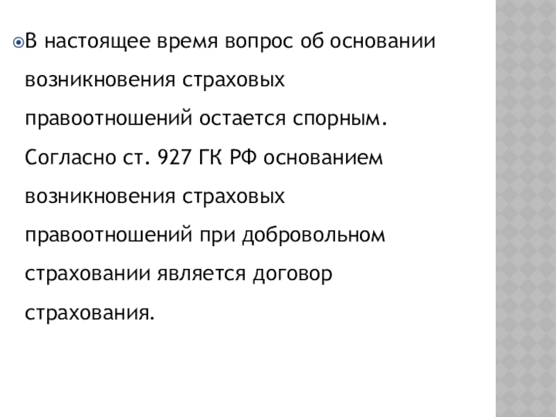 Слайд 3В настоящее время вопрос об основании возникновения страховых правоотношений остается спорным.