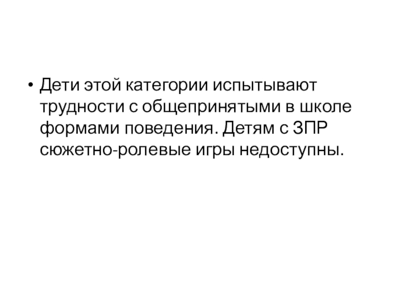 Дети этой категории испытывают трудности с общепринятыми в школе формами поведения. Детям с ЗПР сюжетно-ролевые игры недоступны.