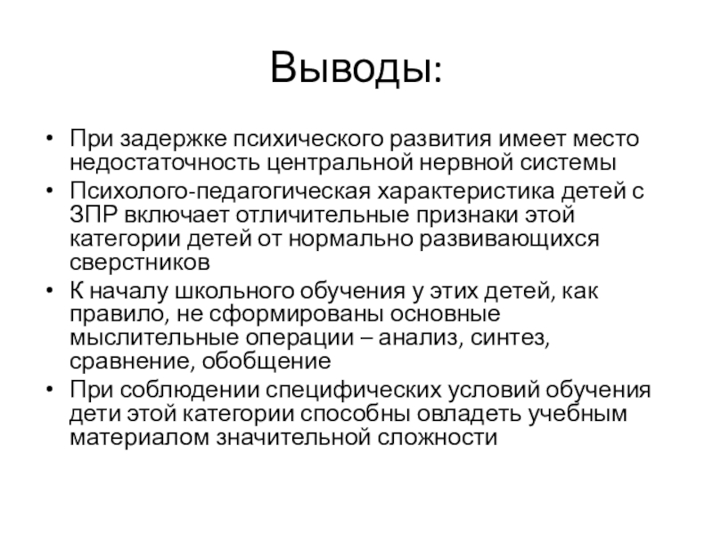 Выводы:При задержке психического развития имеет место недостаточность центральной нервной системыПсихолого-педагогическая характеристика детей с ЗПР включает отличительные признаки