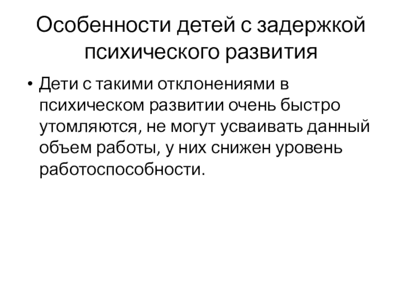Особенности детей с задержкой психического развитияДети с такими отклонениями в психическом развитии очень быстро утомляются, не могут усваивать данный объем работы, у них снижен уровень работоспособности.