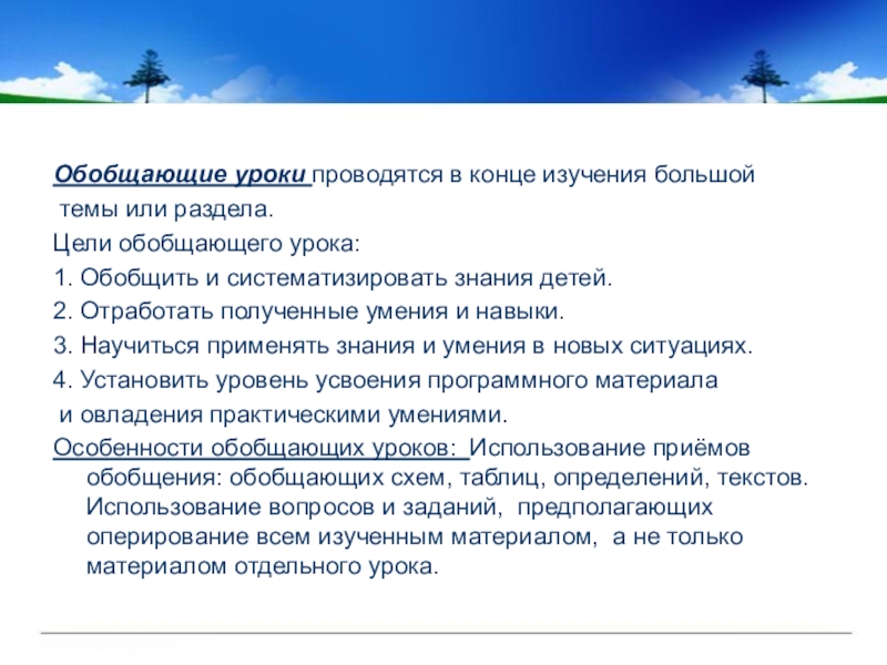 Особенности обобщающих уроков: Использование приёмов обобщения: обобщающих схем, таблиц, определений, текстов. Использование вопросов и заданий, предполагающих оперирование всем изученным материалом, а не только материалом отдельного урока.
