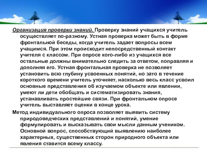 Метод индивидуального опроса позволяет выявить систему природоведческих представлений и понятий, умение формулировать и высказывать свои мысли данным учеником. Основной вопрос, способствующий выявлению наиболее характерных, существенных сторон природного объекта или явления ставится всему классу.