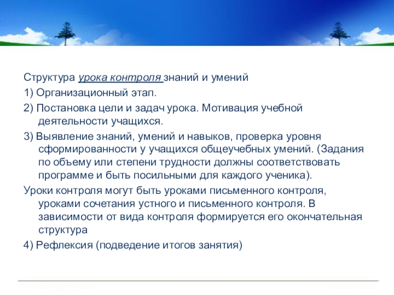 Уроки контроля могут быть уроками письменного контроля, уроками сочетания устного и письменного контроля. В зависимости от вида контроля формируется его окончательная структура