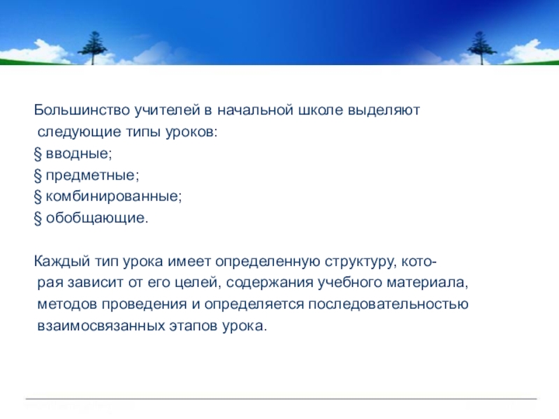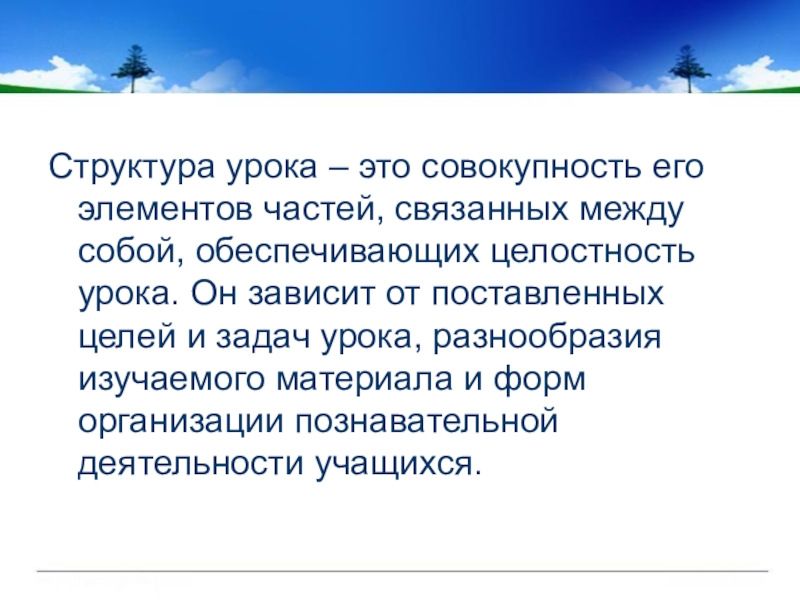 обеспечивающих целостность урока. Он зависит от поставленных целей и задач урока, разнообразия изучаемого материала и форм организации познавательной деятельности учащихся.