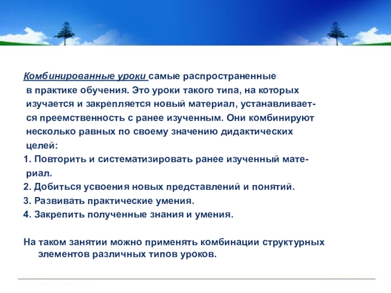 На таком занятии можно применять комбинации структурных элементов различных типов уроков.