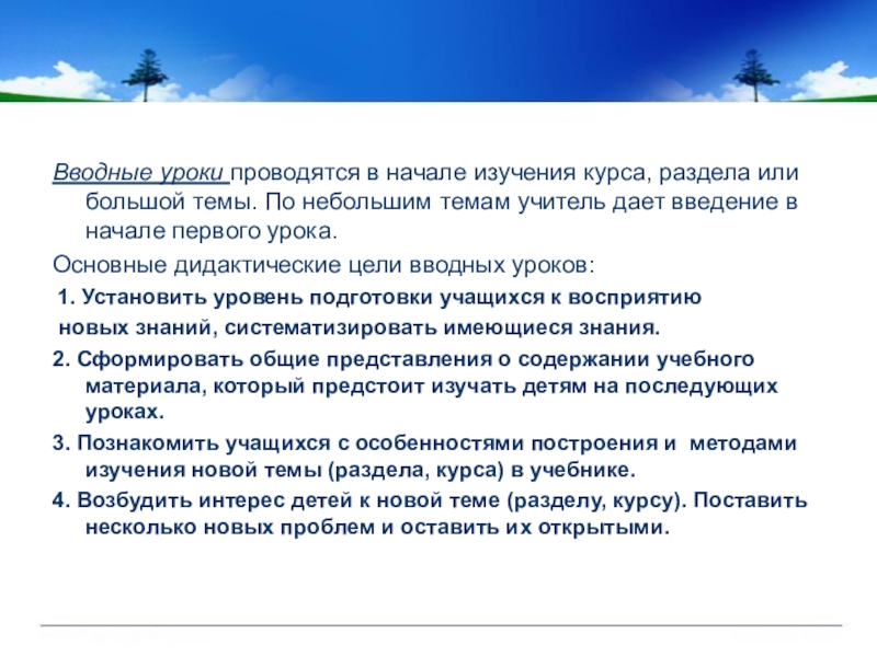 Вводные уроки проводятся в начале изучения курса, раздела или большой темы.