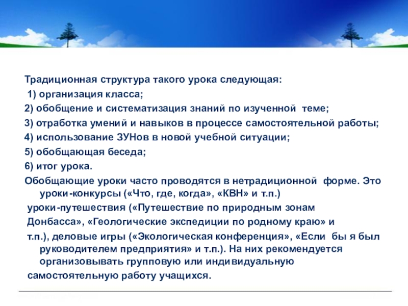 Обобщающие уроки часто проводятся в нетрадиционной форме. Это уроки-конкурсы («Что, где, когда», «КВН» и т.п.)