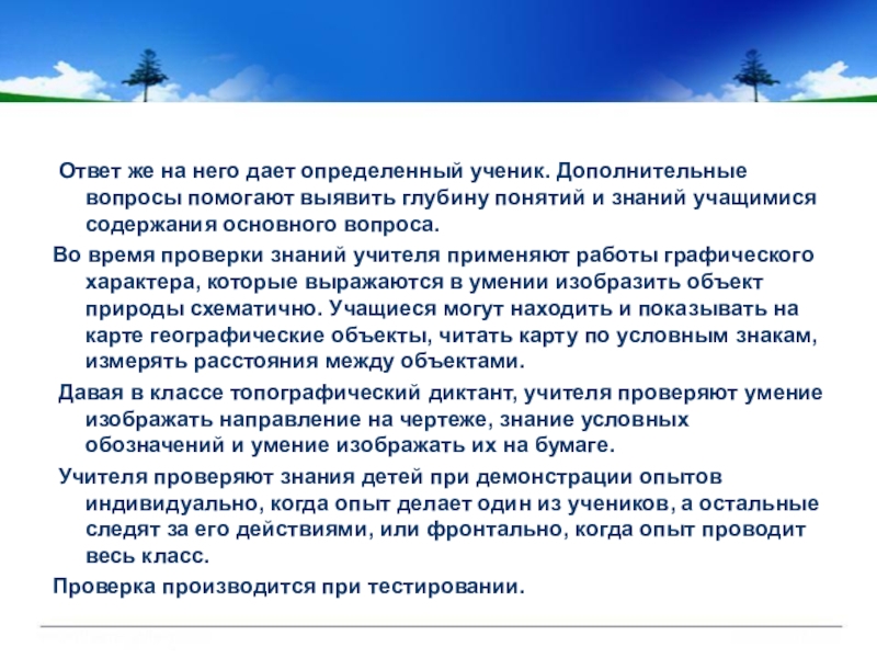Во время проверки знаний учителя применяют работы графического характера, которые выражаются в умении изобразить объект природы схематично. Учащиеся могут находить и показывать на карте географические объекты, читать карту по условным знакам, измерять расстояния между объектами.