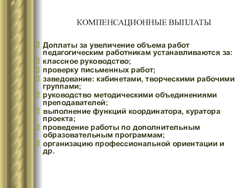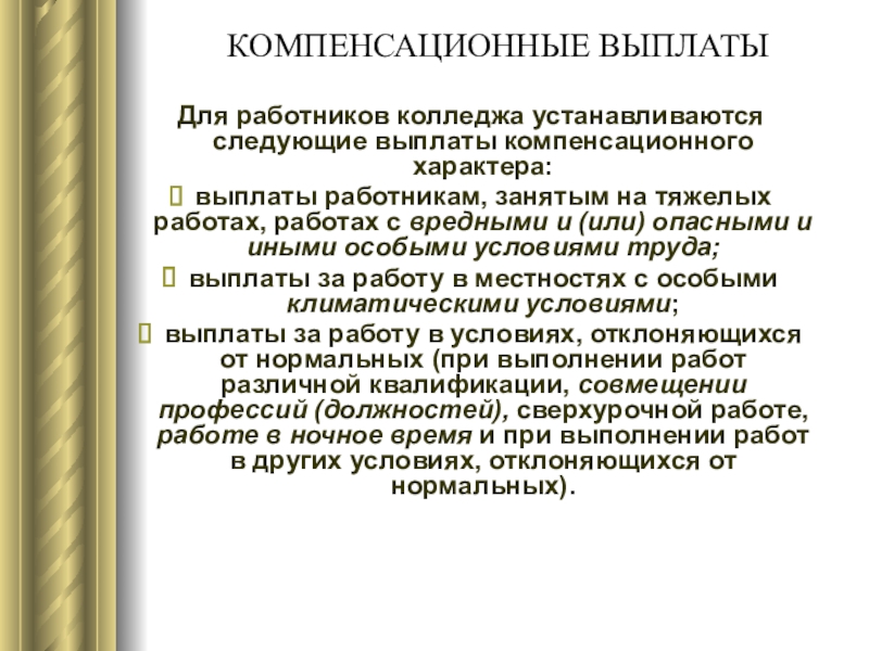 Слайд 35Для работников колледжа устанавливаются следующие выплаты компенсационного характера: