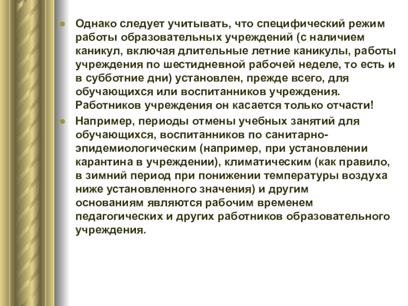 Слайд 18Однако следует учитывать, что специфический режим работы образовательных учреждений (с наличием