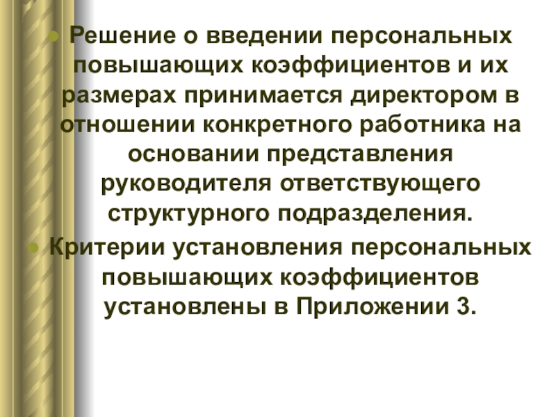Слайд 38Решение о введении персональных повышающих коэффициентов и их размерах принимается директором
