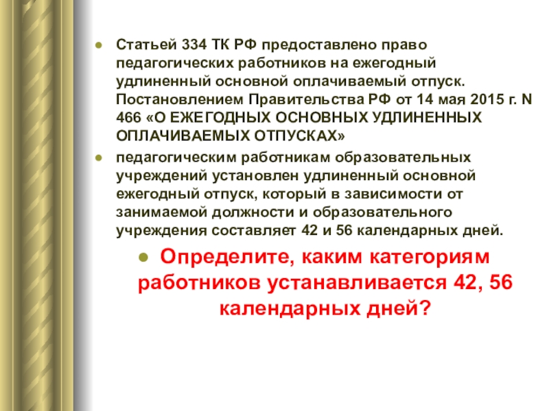 Слайд 23Статьей 334 ТК РФ предоставлено право педагогических работников на ежегодный удлиненный основной оплачиваемый