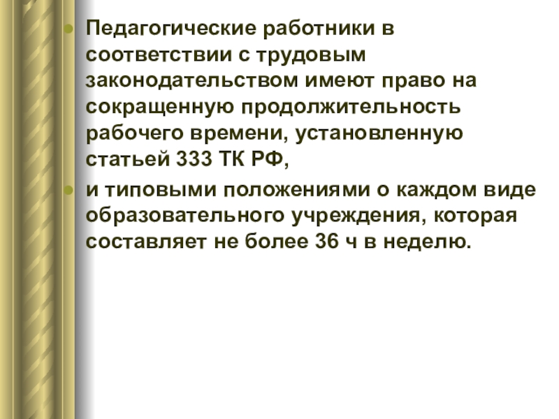 Слайд 13Педагогические работники в соответствии с трудовым законодательством имеют право на сокращенную