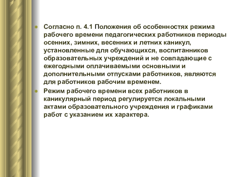 Слайд 19Согласно п. 4.1 Положения об особенностях режима рабочего времени педагогических работников