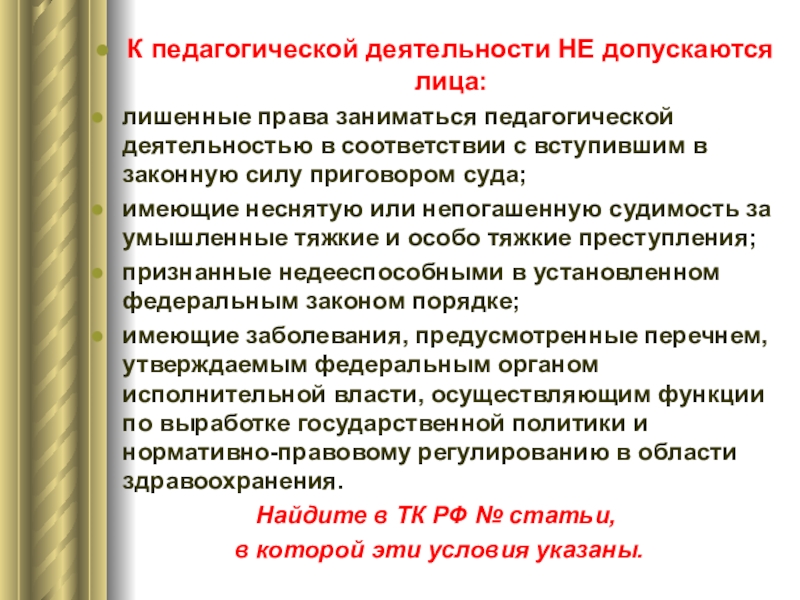 Слайд 8К педагогической деятельности НЕ допускаются лица: