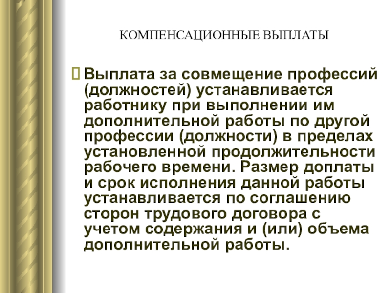 Слайд 36Выплата за совмещение профессий (должностей) устанавливается работнику при выполнении им дополнительной