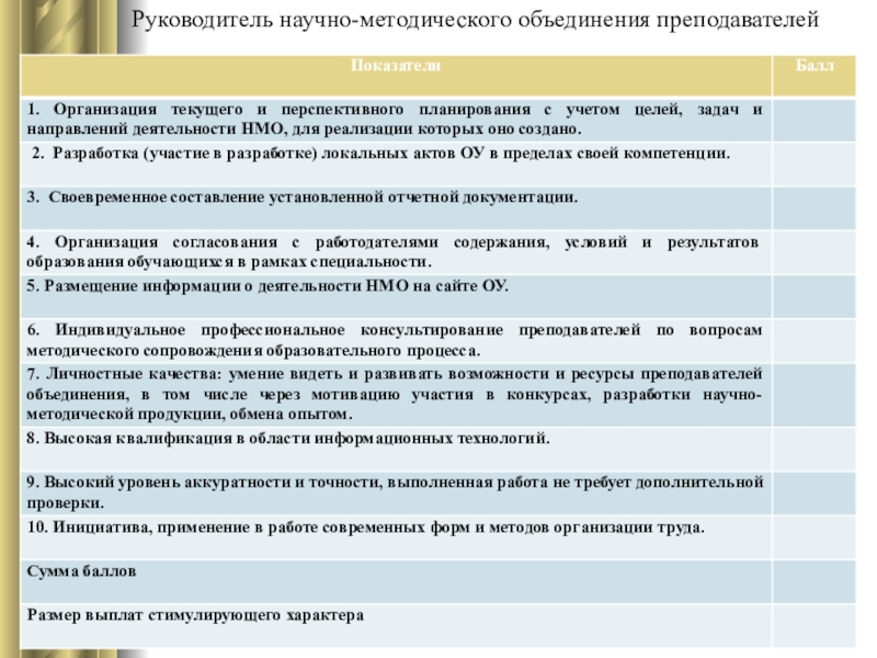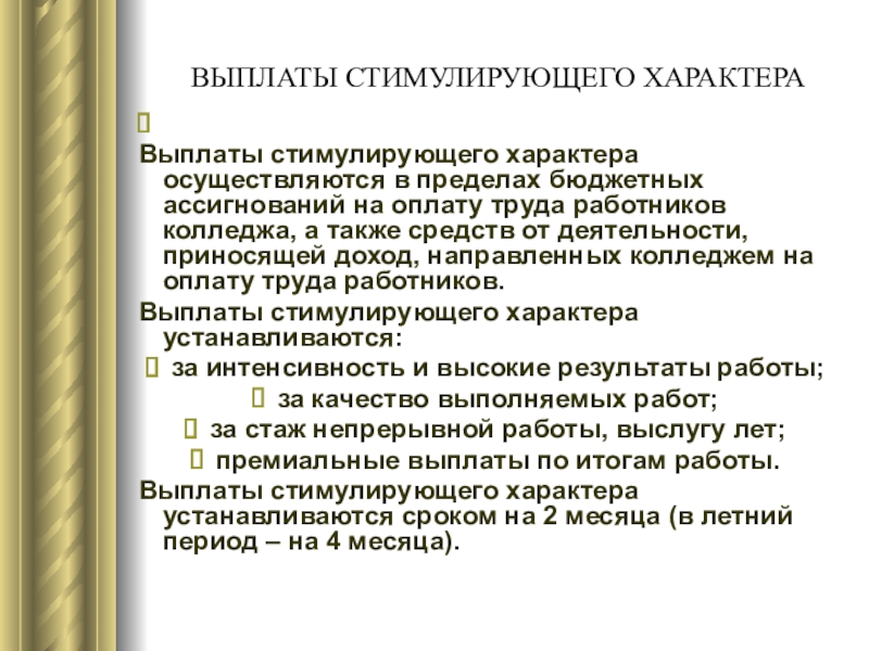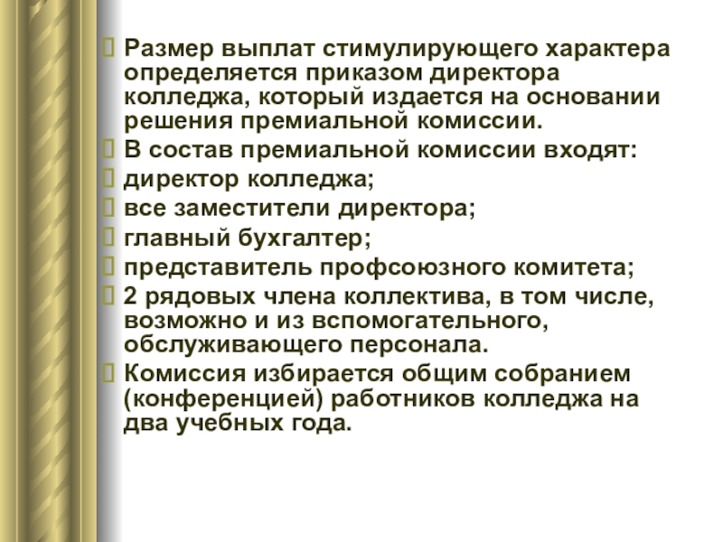Слайд 41Размер выплат стимулирующего характера определяется приказом директора колледжа, который издается на