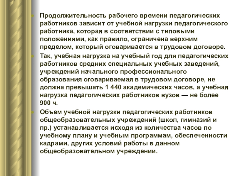 Слайд 14Продолжительность рабочего времени педагогических работников зависит от учебной нагрузки педагогического работника,