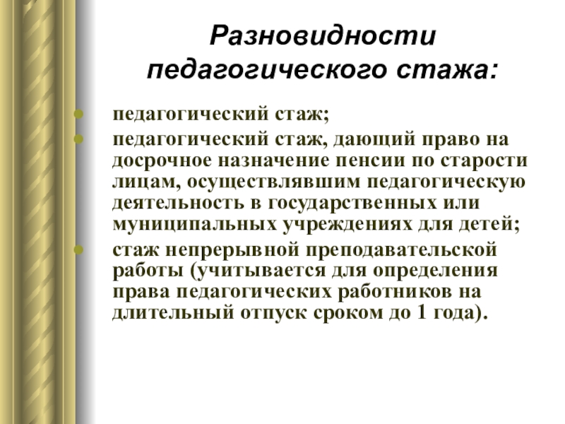 Слайд 30Разновидности педагогического стажа: