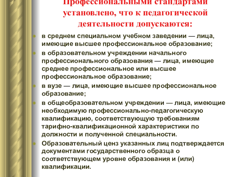 Слайд 7Профессиональными стандартами установлено, что к педагогической деятельности допускаются:
