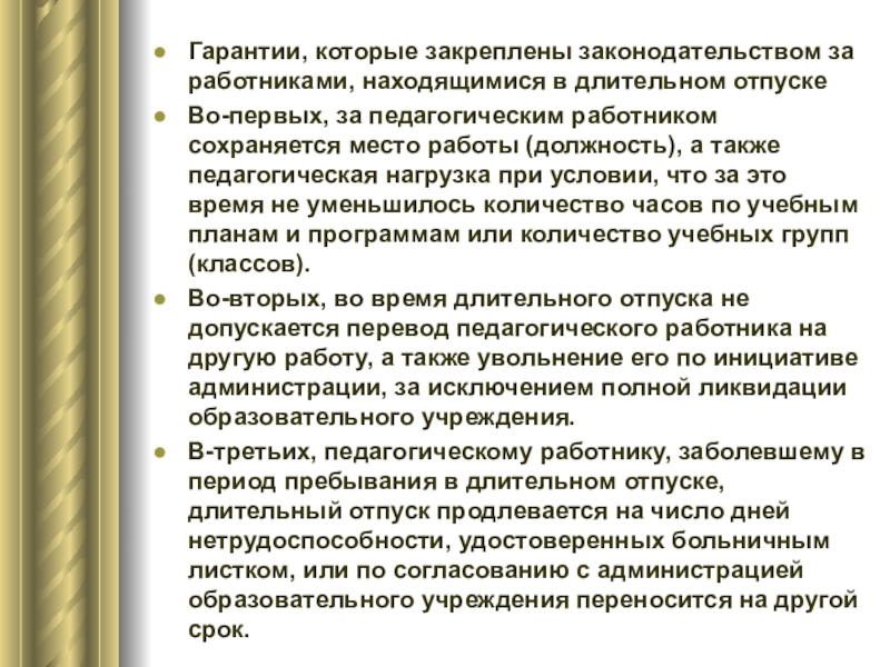 Слайд 25Гарантии, которые закреплены законодательством за работниками, находящимися в длительном отпуске