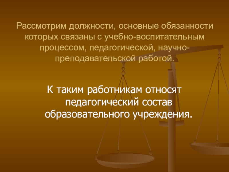 Слайд 3Рассмотрим должности, основные обязанности которых связаны с учебно-воспитательным процессом, педагогической, научно-преподавательской