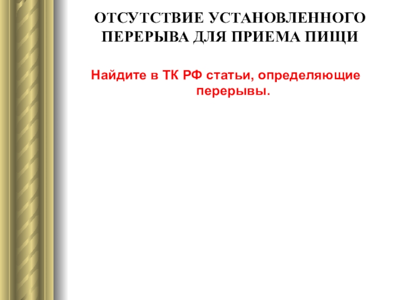 Слайд 20ОТСУТСТВИЕ УСТАНОВЛЕННОГО ПЕРЕРЫВА ДЛЯ ПРИЕМА ПИЩИ