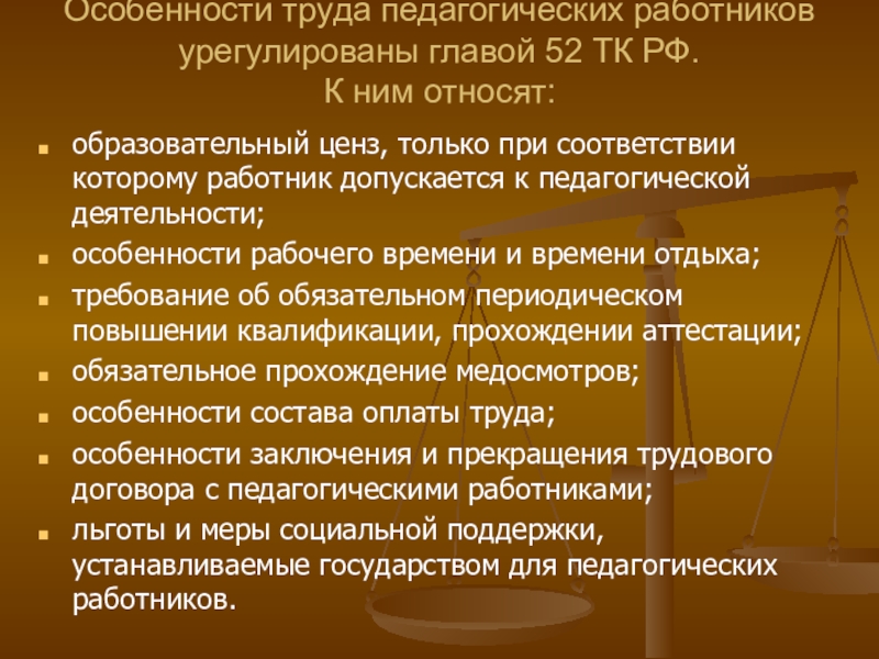 Слайд 6Особенности труда педагогических работников урегулированы главой 52 ТК РФ.