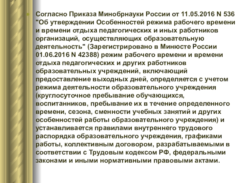 режима рабочего времени и времени отдыха педагогических и иных работников организаций, осуществляющих образовательную деятельность" (Зарегистрировано в Минюсте России 01.06.2016 N 42388) режим рабочего времени и времени отдыха педагогических и других работников образовательных учреждений, включающий предоставление выходных дней, определяется с учетом режима деятельности образовательного учреждения (круглосуточное пребывание обучающихся, воспитанников, пребывание их в течение определенного времени, сезона, сменности учебных занятий и других особенностей работы образовательного учреждения) и устанавливается правилами внутреннего трудового распорядка образовательного учреждения, графиками работы, коллективным договором, разрабатываемыми в соответствии с Трудовым кодексом РФ, федеральными законами и иными нормативными правовыми актами.